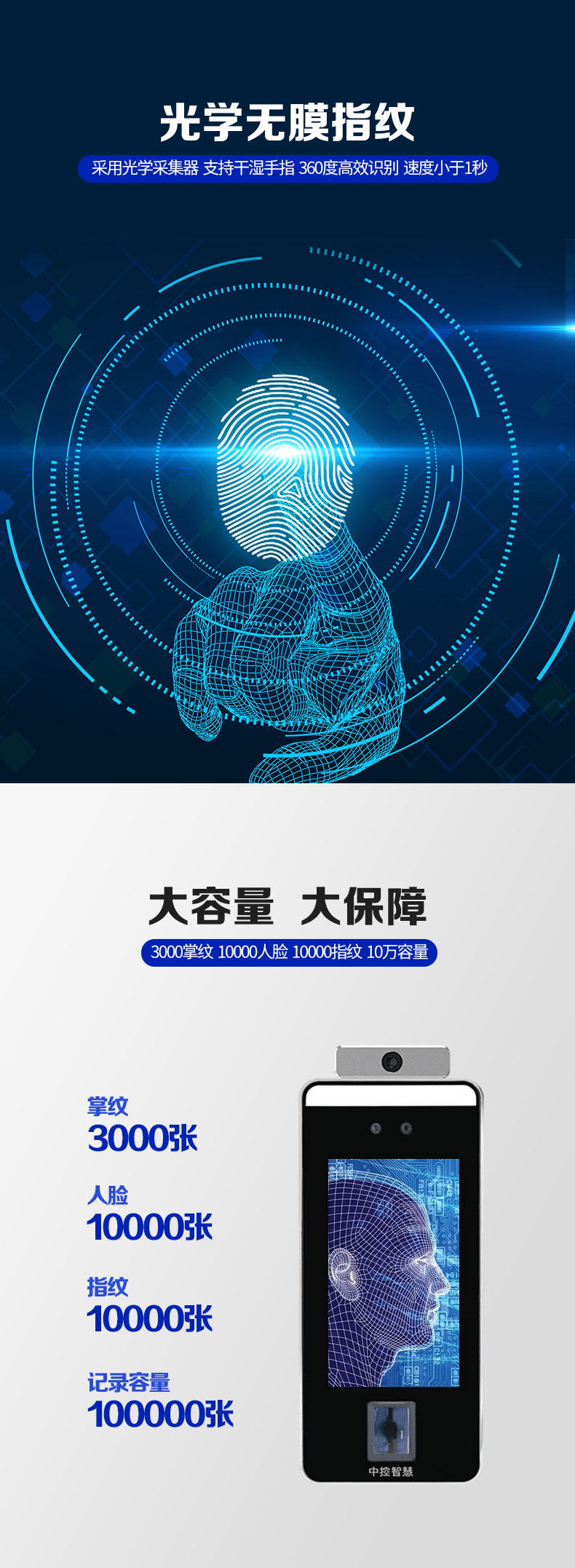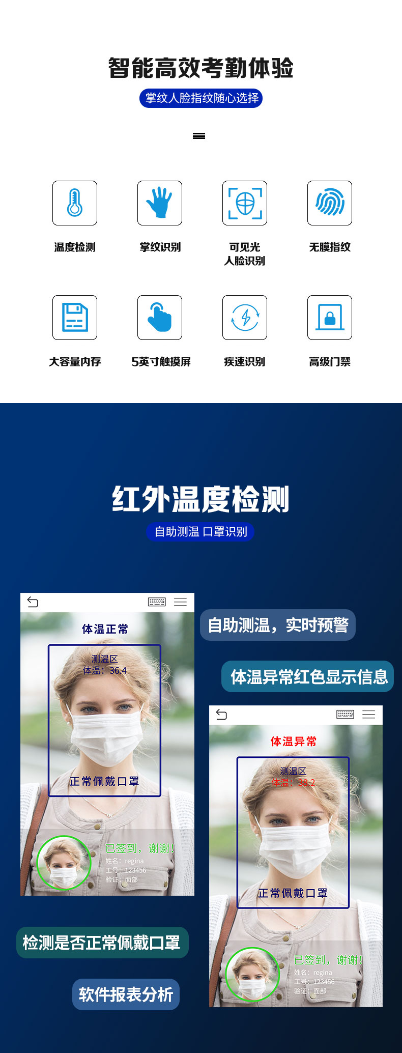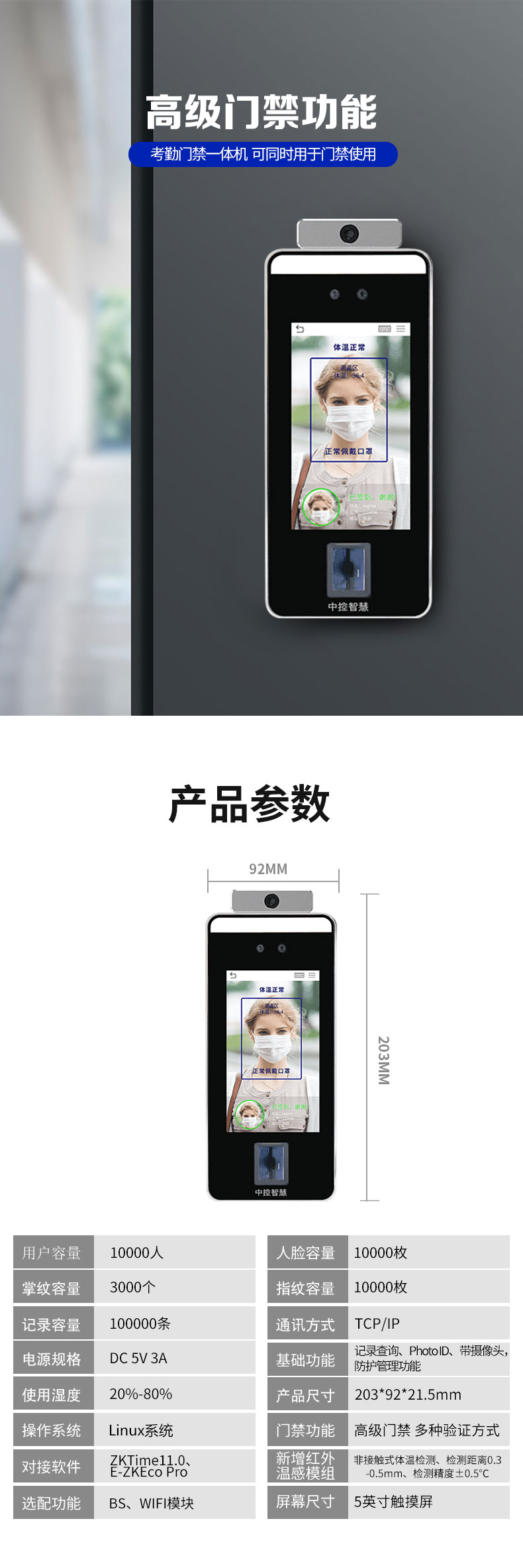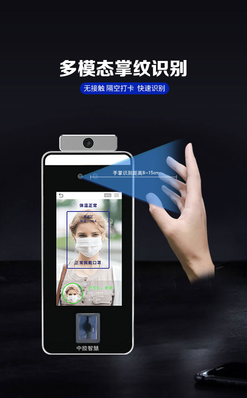 非接觸式掌紋門禁xface600plus是一款測溫門禁智能終端,搭載測溫模塊;選配WiFi導數據 非接觸式掌紋門禁xface600plus系列基于熵基科技深度學習算法,通過對人的掌紋或臉部、指紋特征信息實現快速身份識別,讓人們享受到更加安全、便捷、高效的通行體驗,推出的非接觸式混合生物識別終端。xFace600-Plus還搭載高性能紅外體溫檢測模塊,人員通行時即時檢測人表體溫并報警,提供更為安全、便捷、高效的通行體驗。另外,xFace600-Plus廣泛適用于社區、校園、醫院、景區、酒店、商場、寫字樓、公共服務場所等場景。